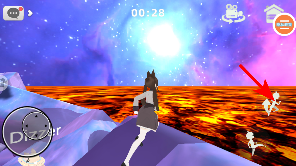 4、进入星空岩浆场景后,紧跟红色箭头指引,操作移动按钮控制角色避开岩浆区域,朝着安全的平台前进,完成目标。
