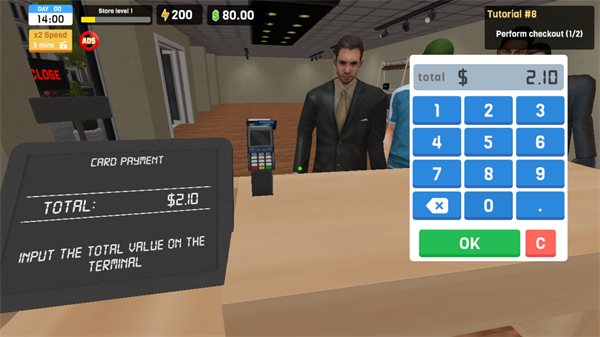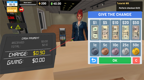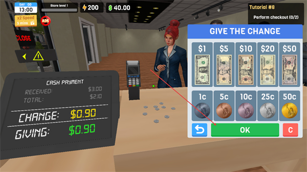 1、在收银台等待顾客,目标是完成2次检查,准备处理交易。