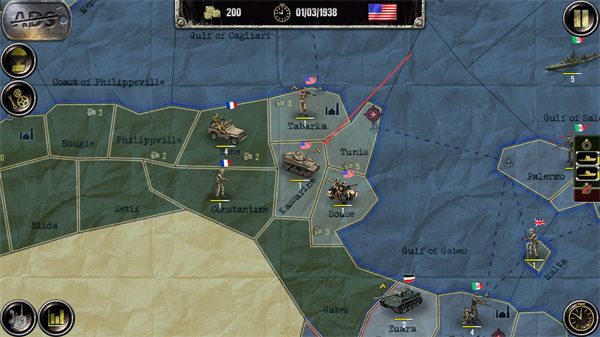 3、选择己方坦克部队,规划移动路线如向Tunis方向推进,调整部队位置。