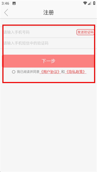 4、在注册页面,填信息并勾选协议后点击下一步按钮即可完成注册流程。