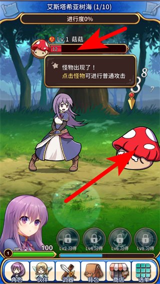 2、怪物出现后点击目标怪物,进行普通攻击推进战斗流程。