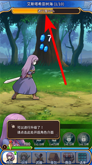 4、查看顶部的进度条,点击对应区域开启角色界面升级。