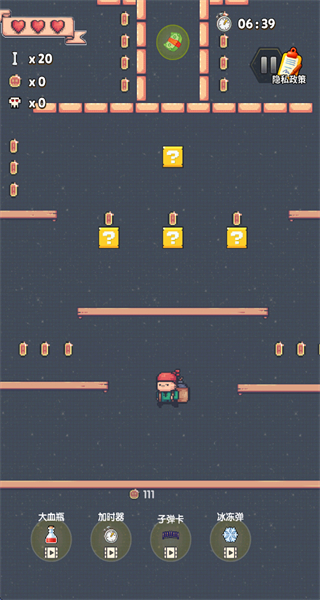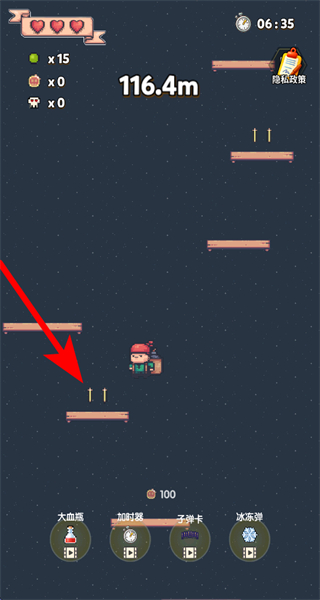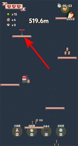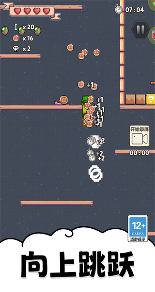 2、进入关卡后,操控小弟角色在平台间跳跃前进,同时收集场景中的道具。