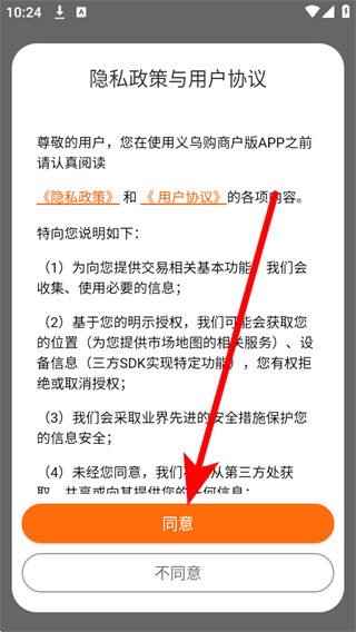 1、打开义乌购商户端,在弹窗中点击同意,进入登录操作界面。