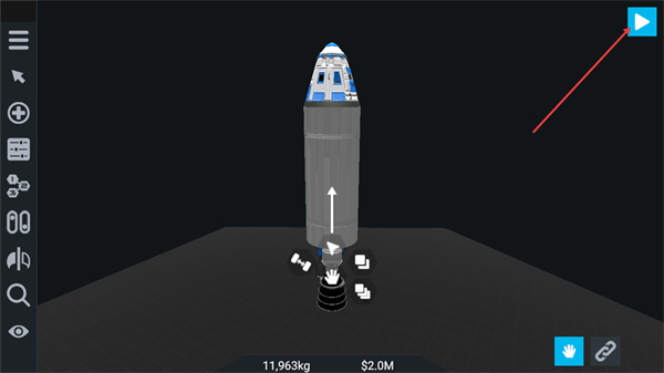 1、进入火箭组装界面后,可查看当前火箭11963kg的重量及2M的成本,点击界面右上角的播放按钮,即可进入火箭发射准备环节。