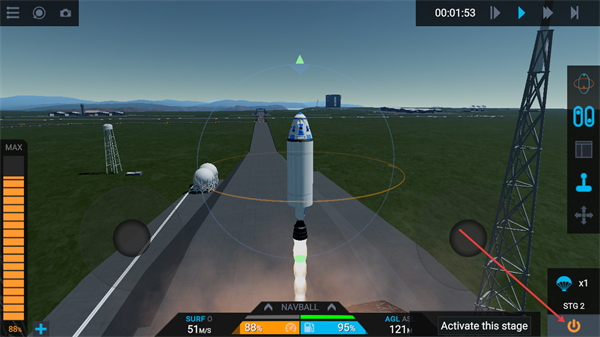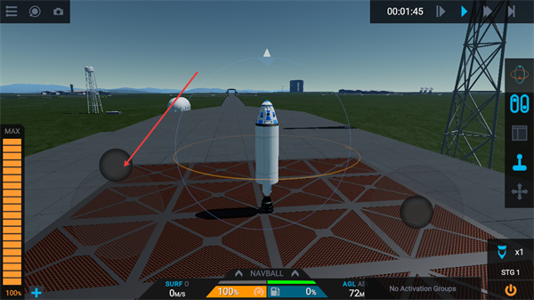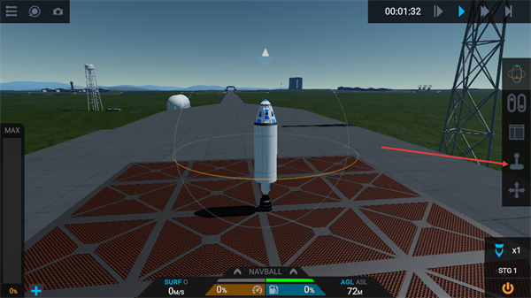 2、进入发射场景后,可通过界面右侧的控制按钮调整火箭姿态,关注NAVBALL的导航指引,当前AGL显示高度为72m,保持火箭稳定在发射台区域。