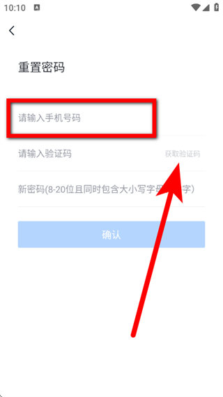 3、在重置密码页面,输入手机号码,点击获取验证码。