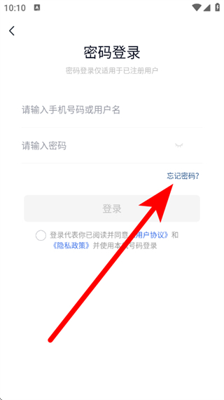 2、在密码登录页面,点击忘记密码按钮,进入重置密码页面。