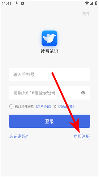 1、打开读写笔记,在弹窗中点击同意,进入登录相关操作界面。