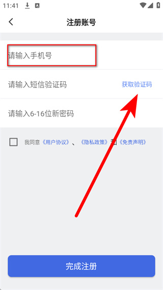 4、将收到的短信验证码填入短信验证码栏,设置密码,勾选相关协议后,点击完成注册,完成账号密码的注册。