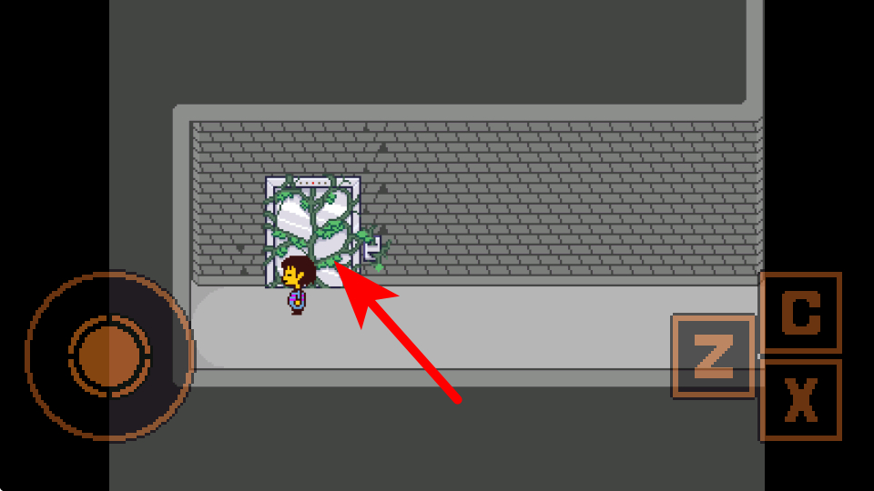 1、进入当前场景后,依照红色箭头指引,操作左侧移动轮盘控制角色靠近目标装置如被植物覆盖的门,准备触发互动或解锁新路径。