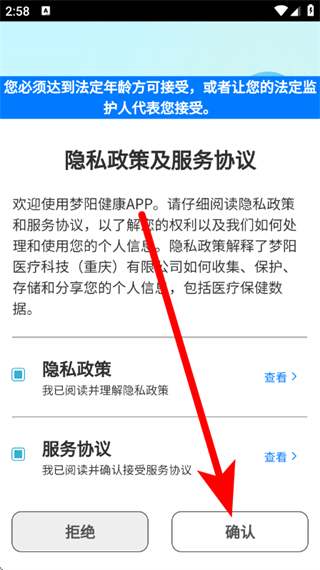 1、在梦阳健康页面,勾选后,点击确认,进入登录页面。