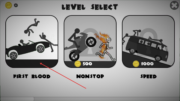 2、进入LEVELSELECT界面后,可选择已解锁的关卡如FIRSTBLOOD,部分关卡需消耗对应金币解锁,点击关卡即可进入游玩。