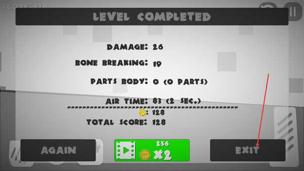 4、关卡完成后会显示LEVELCOMPLETED界面,可点击AGAIN重玩该关卡,或点EXIT返回关卡选择界面,也可看广告获得双倍金币。