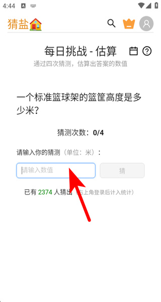 1、在每日挑战-估算中,点击输入框,输入你猜测的标准篮球架篮筐高度数值,再点猜提交,共4次猜测机会。