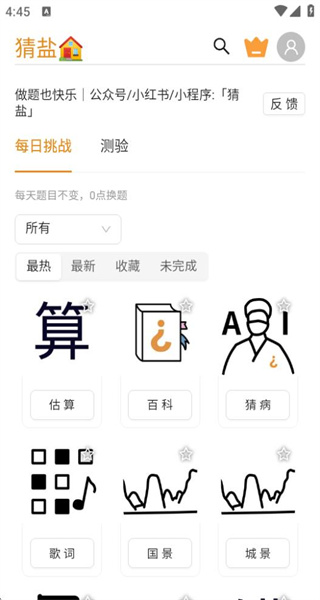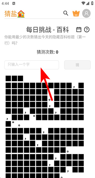 2、每日挑战-百科里,在输入框输入一个字后点猜,通过多次尝试,用最少次数猜出隐藏的百科标题内容。