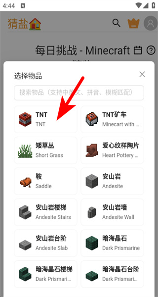 3、每日挑战-Minecraft选物品时,在列表中找到TNT选项并点击,即可选择该物品参与对应挑战环节。
