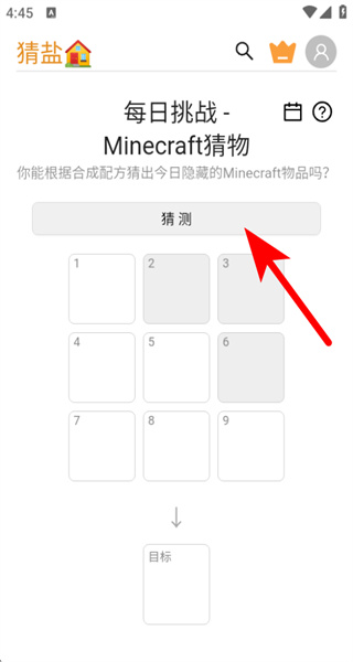 4、在Minecraft猜物挑战中,根据合成配方思路,点击猜测按钮提交你推测的物品,通过线索锁定物品。