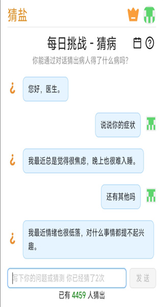 猜病是一款模拟真实问诊场景的休闲猜谜游戏,扮演医生通过线上问诊与病人对话,自主输入问题追问病情,根据病人回答提取关键线索,判断病症并输入答案得分,玩法简单且代入感强,感受问诊推理的乐趣。