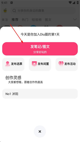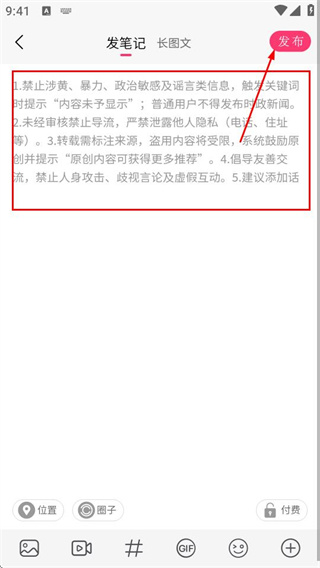 3、在发笔记页面,编辑内容后,点击发布按钮即可发布笔记。