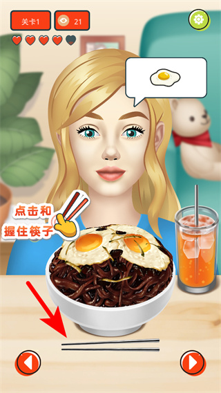 2、关卡内按照提示,点击并操作下方的筷子按钮,握住筷子道具,后续夹取食物互动做准备。