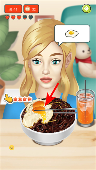 4、将夹取的食物如带溏心的煎蛋移动到角色嘴边,完成投喂动作,达成吃播的互动目标。