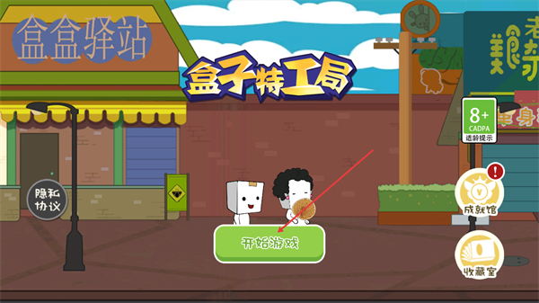 1、进入盒子特工局的游戏初始界面后,找到界面中的开始游戏按钮,点击它即可进入游戏开启相关的特工任务体验。