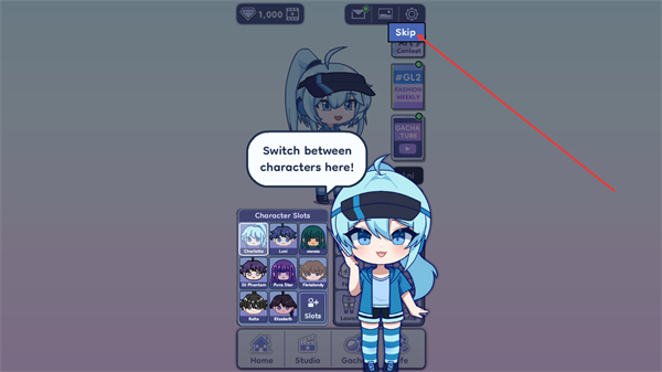 1、在该界面中按提示,可在CharacterSlots切换角色,若想跳过提示可点击界面的Skip按钮推进流程。