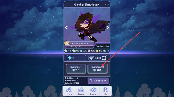 2、进入GachaSimulator界面后,可选择Summon10按钮,消耗对应钻石进行十连召唤操作来获取角色。