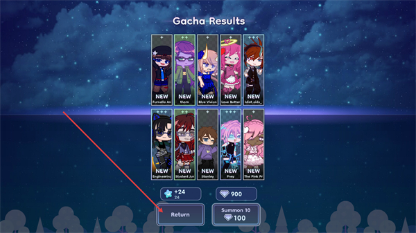 4、在GachaResults界面,查看完获得的角色后,点击Return按钮可返回之前的界面,继续进行其他操作。