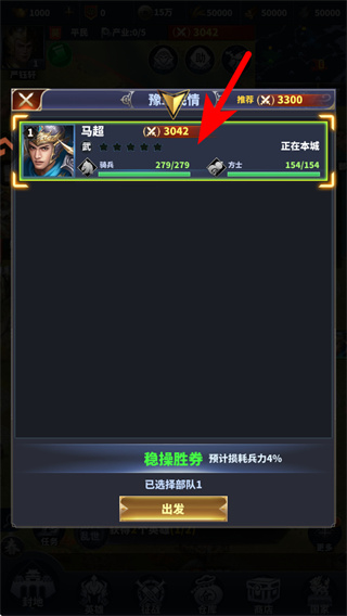 4、选择已创建的部队如马超部队后,点击出发按钮,派遣部队前往清缴叛军,推进任务进度。