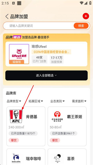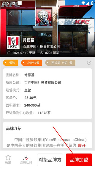 2、在品牌加盟页面,点击目标品牌,可进入该品牌的详情页面。