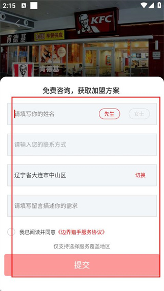 4、在咨询页面,填写信息并勾选协议后,点击提交按钮即可提交加盟咨询。