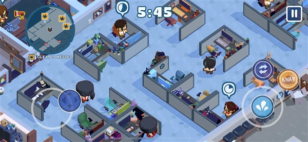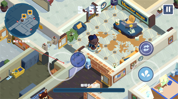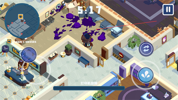 3、潜行+清理双重核心玩法,探索不断扩大的办公室空间时,需躲避同事与上司的视线,避免狼人身份暴露;同时使用扫帚、拖把、清洁剂等工具,污渍以及自身狂暴留下的痕迹。