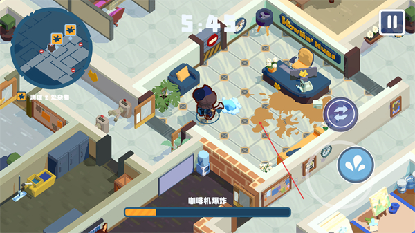 3、轻量化操作易上手,核心操作围绕移动、潜行、工具使用展开,点击拖拽即可完成清洁动作,新手能快速掌握,无需复杂操作就能沉浸在游戏的喜剧氛围中。