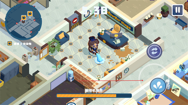 1、在关卡中操控狼人清洁工移动到污渍区域,点击喷水工具开始清洁如清理咖啡渍。