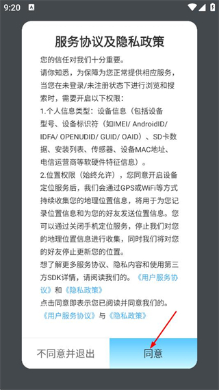 1、阅读用户服务协议和隐私政策后,点击弹窗中的同意按钮。