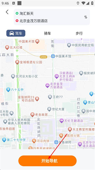 4、在路线规划页面,确认出行方式后,点击开始导航启动导航。