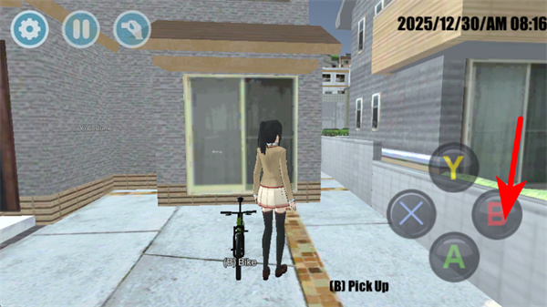 3、紧跟红色箭头指引,点击B按钮执行Pick Up操作,拾取场景中的自行车,完成物品交互以推进游戏。