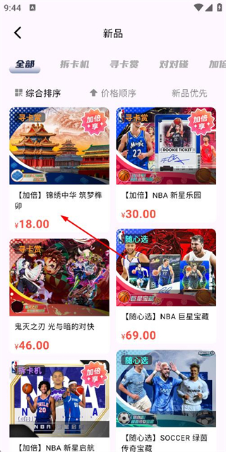 2、在新品页面点击目标商品条目,进入该商品的寻卡赏详情页面。