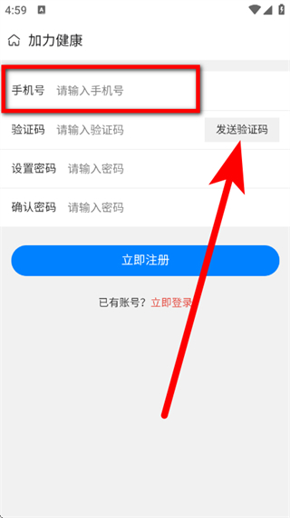 4、在注册页面,输入手机号,点击发送验证码,获取验证码。