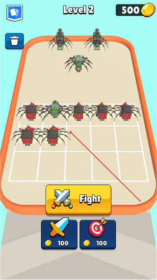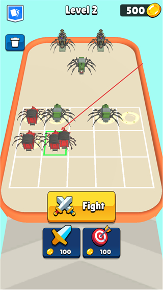 1、在Level2界面,准备将相同小火车合成,点击Fight按钮,让小火车参与战斗。