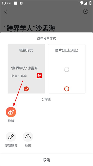 2、在新闻详情页,点击右上角的分享按钮,可打开分享方式选择面板。