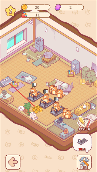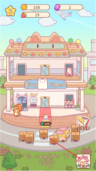 1、进入猫咪健身房建筑界面,点击带有可爱猫标识的小门进入健身房内部,同时可查看主线任务或点击界面的建造按钮进行建筑相关操作。