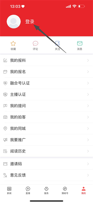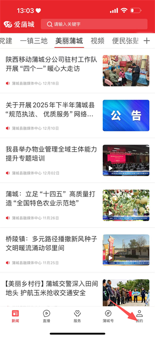 1、在爱蒲城新闻页面,点击底部的我的,进入个人页面。