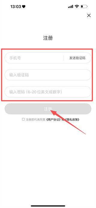 4、在注册页面,填写手机号喝验证码、设置密码,点击注册,完成注册。
