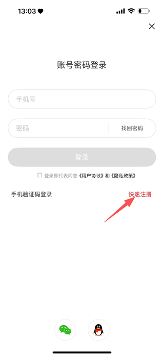 3、在登录页面,点击快速注册的选项,即可进入注册页面。