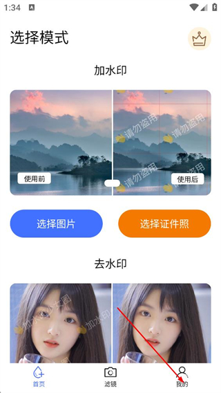 1、在选择模式页面,点击底部我的选项,进入个人中心页面。