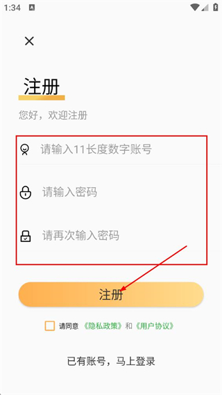 4、在注册页面,填写账号,密码,确认密码,点击注册按钮完成注册。