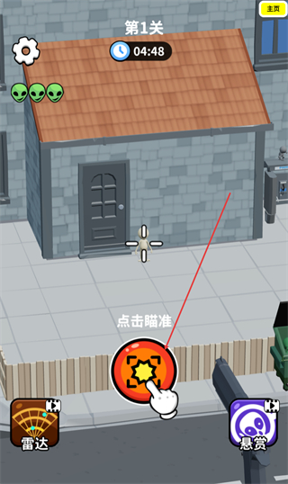 2、进入第1关,点击瞄准按钮,对准目标区域,准备定位外星人。
